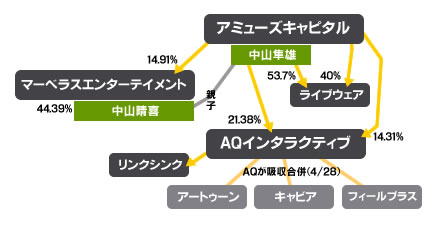 マーベラスとAQとかの件で4年前を思い出した 「マーベラスとAQインタラクティブとライブウェアが合併」というニュースが昨日は盛り上がってました。「牧場物語」というヒット作を持つマーベラスと、「ブラウザ三国志」など、ブラウザゲームに強みのあるAQインタラクティブ、携帯SNSゲームに強いライブウェアと、それぞれ強みがあり、合併によりさらなる進化が期待できそうだなと思いました。合併自体の整合性は凄く取れている気がします。ただ上記の相関図を見ると、中山家の資産整理のようにも感じてしまう部分も・・・。ところで、リンクシンクはAQの子会社になったんだね。しかも結構前に。知らなかった。ブログペットで有名なリンクシンクさんとは少しだけ面識があります。4年程前、僕がコンソートからサムライに復帰した頃の話。何だか知らないけど合宿に行って、事業計画やらを考える事になっていて、乗り気ではなかったけど参加する事になりました。確かpod氏が凄く乗り気だった記憶が。メンバーはpod氏、G氏、ray氏と僕の4人。当時の役員構成などを考えてもおかしなメンバーです。まぁ僕はコンソートから戻ったばかりでよくわからなかったので、とりあえず流れにまかせてINSPIRON 6400(重い)を抱えて参加したというわけ。その時のエントリーはこちら。それはさておき、その合宿をした宿に、ほぼ同じ日程でリンクシンクさんも合宿に来ていて、簡単な情報交換をした思い出が。当時ブログペットが注目されてた企業でした。みなさん、元気ですかね。 http://takanori.blog.shinobi.jp/Entry/348/マーベラスとAQとかの件で4年前を思い出した