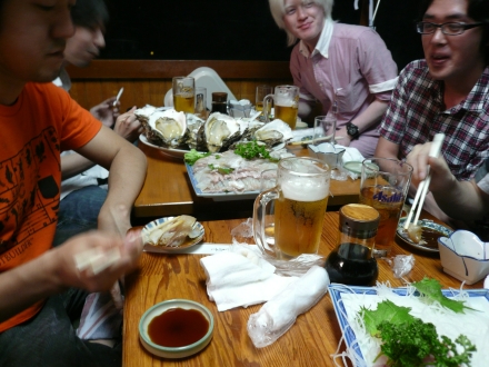 SASHIMI NIGHT 昨夜はG/P/S/他で魚を食べに行きました。牡蠣だ刺身だー!(まだ元気だった)うひょーどひゃー・・・目測を誤って注文しすぎました。しばらく魚とは距離を置きたいと思いました。※刺身は美味しかったですよ! http://takanori.blog.shinobi.jp/Entry/245/SASHIMI NIGHT