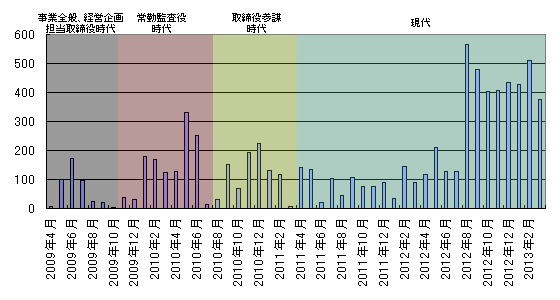 自分のTwitterログをダウンロードしてみた 自分のTweetしたログをダウンロードできるって話が話題になってたのでやってみました。やり方はnanapiさんの記事をご覧ください。 基本的にはTweet数とメンタルが比例しているのですが、最近はTweet数の絶対数が上がってるので判断しにくくなっている感じ。いろいろやってた取締役の後期はだんだん数が減っていって、監査役になって少しずつ回復していって、また取締役云々の話が出てきた頃に減っていって、回復して、また減っていって・・・というサイクルがわかります。「現代」は時折スコーンってつぶやかない月があったりしたけど、最近は比較的多い。最近は月単位ではなく、日単位でサイクルしてるかもしれない。まぁどうでもいいのだけども。過去ログを見るのは楽しい。Twitterの過去ログは反射的で瞬発的なものも多いので、ブログなどの過去ログとはまた違った趣向で面白い。しかし、一番最初のつぶやき、なんなんでしょうね・・・。会社にいます— 大柴貴紀 Takanori Oshibaさん (@takanori1976) 2009年4月10日CSVではなく、HTML形式で過去ログを見せるってのはある意味斬新だなぁって思いました。 http://takanori.blog.shinobi.jp/Entry/392/自分のTwitterログをダウンロードしてみた