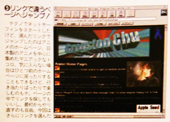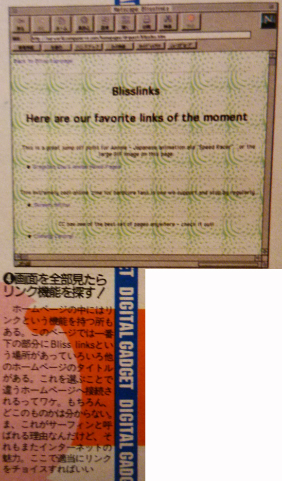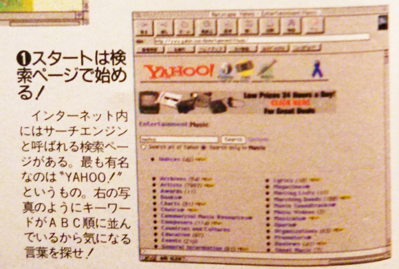 インターネットは簡単、サーフィンはこんなに簡単 インターネットが苦手なのでどうしたものかと悩んでいたら、ふと本棚から手に取った雑誌に「インターネットは簡単 サーフィンはこんなに簡単」という記事があったので、藁にもすがる思いで読んでみました。1.スタートは検索ページで始める!YAHOO!というページがあるみたい。全部英語だけど、アルファベット順にサイトが並んでるみたい。電話帳みたいだね。画面がぐにゃぐにゃしてるのは僕の写真技術が悪いからです。すみません。2.見たいジャンルをリストから選ぶ音楽のページを開いてNEWって書いてあるページを見てみようと思います。「危ない系のキーワード」にも興味はひかれるけど・・・。3.最初のページで画像を楽しむ音楽系のページだけど、まずは画像を楽しむのが良いらしい。お寿司屋さんでいきなりトロを食べちゃうようだと素人っぽいもんね。ページを見たらまずは画像!覚えておこう。4.画面を全部見たらリンク機能を探すなるほど。適当にリンクを選べばいいみたい。簡単!5.リンクで違うページへジャンプ!リンクをクリックしたら違うページに飛んだよ。びっくり。なんだかさっきと違うイメージのページだなぁ・・・。6.グロテスクな画像にたどりつくうわーー。なんかリンクをクリックしたら変なページに飛んだ!!インターネットって結局最後はグロいページにたどりついちゃうのかな・・・。怖いな。というわけで、なんだかインターネットに詳しくなった気がします!!この雑誌にはファッションや恋愛テクニックだけでなく、こういう最先端の話題についてもふれている。これでモテそうだぞ!!って気持ち(かどうかわかんないけど)で購入したHOT-DOG PRESS 96年4月10日号より。先日実家から懐かしくて持ってきました。しかしオチがなんだか凄いですね。 http://takanori.blog.shinobi.jp/Entry/422/インターネットは簡単、サーフィンはこんなに簡単